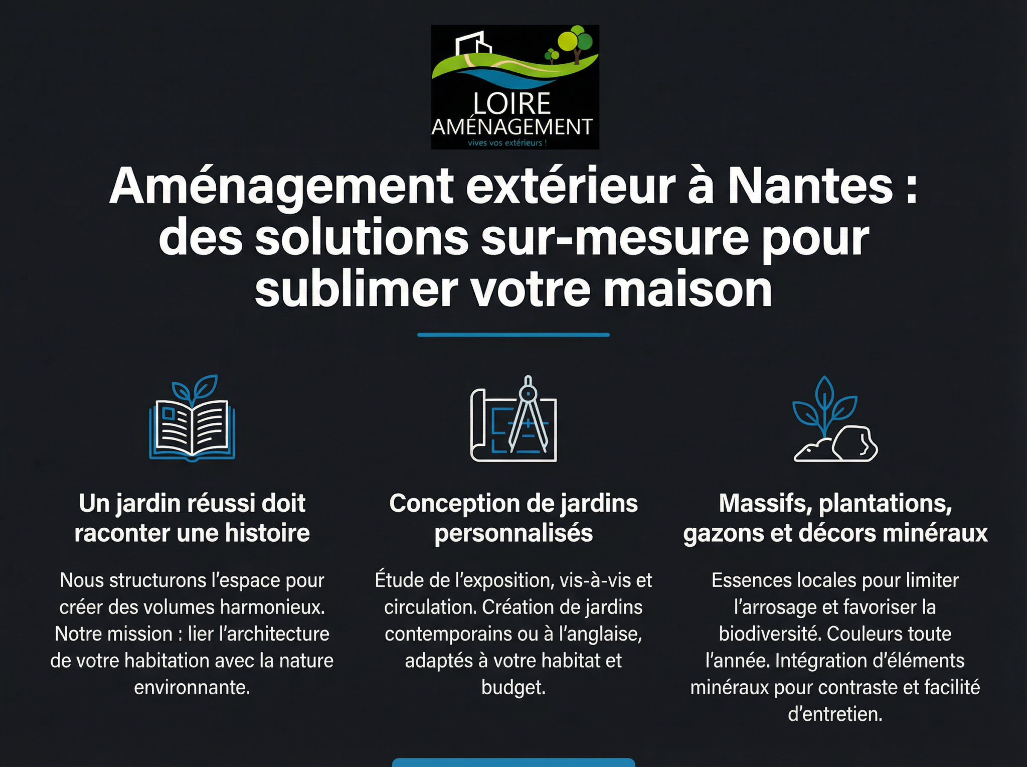 Notre équipe gère l'ensemble du processus. Vous n'avez pas à coordonner différents corps de métier. Pour obtenir une estimation chiffrée, n'hésitez pas à nous solliciter pour un paysagiste à Nantes et un devis détaillé. Nous nous déplaçons pour analyser le terrain et comprendre vos souhaits.
