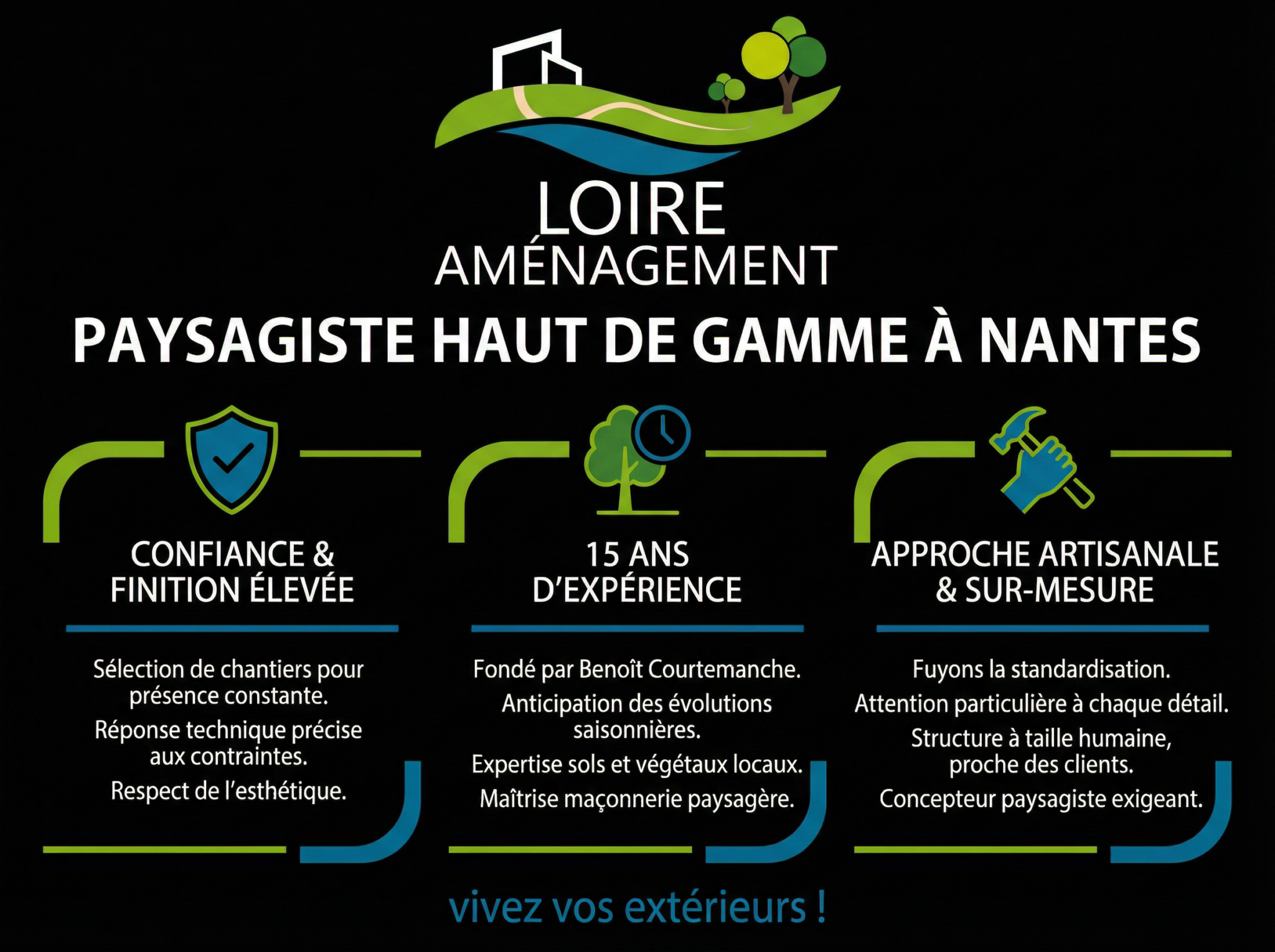 Notre ancrage local nous permet d'être réactifs et disponibles. Nous ne sous-traitons pas la maîtrise d'œuvre : votre interlocuteur connaît votre dossier. En tant qu'entreprise paysagiste intervenant à Nantes, nous bâtissons notre réputation sur la satisfaction de nos clients et le bouche-à-oreille.